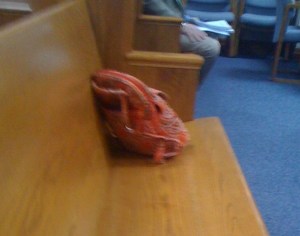 The description: That, kids, is a mini-backpack of the Vera Bradley variety. Neither of those are things that I particularly enjoy. I especially do not enjoy them when they are brought into a courtroom.